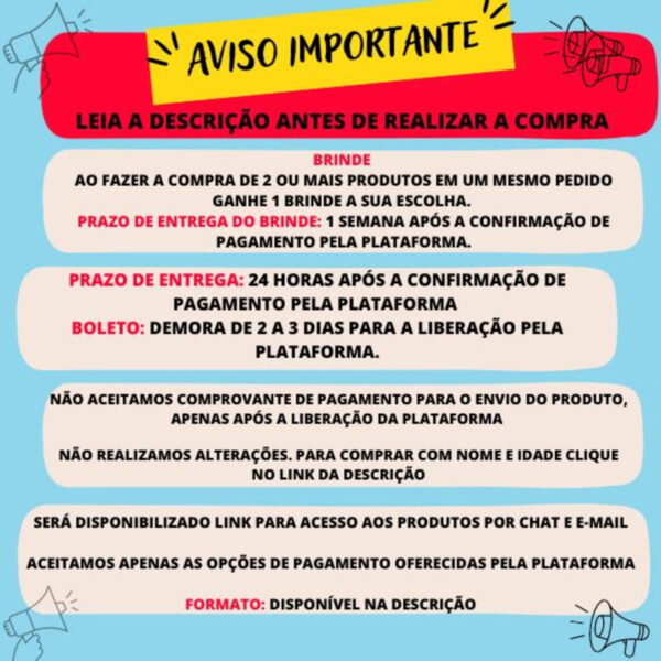 > PRAZO DE ENTREGA: 24H APÓS a confirmação da compra pela plataforma, NÃO aceitamos comprovantes para realização do envio, APENAS após a mensagem da plataforma. As 24h começam a contar a partir do momento da aprovação da compra, e não relacionado ao dia atual.