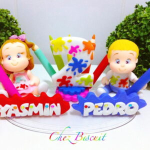 Topo de biscuit inclui a vela e pavio mágico, a placa com o nome da criança e uma boneca ou boneco representando o aniversariante.Caso queira dois bonecos , será aumentado o valor de 25 00 Reais .